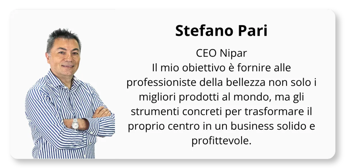 Parla direttamente con Erika Bergamini e il team tecnico Nipar per risolvere i tuoi dubbi e pianificare la crescita del tuo salone.